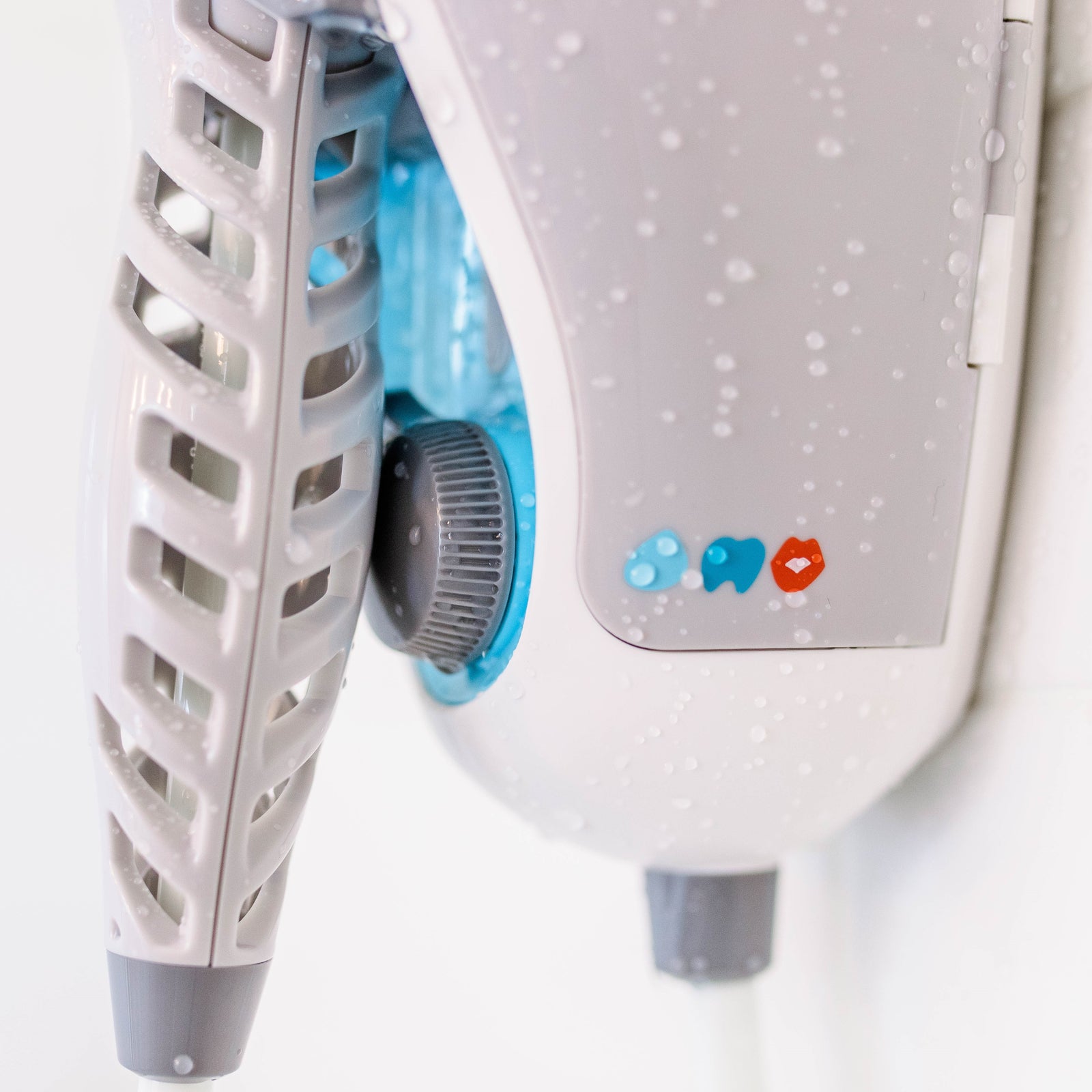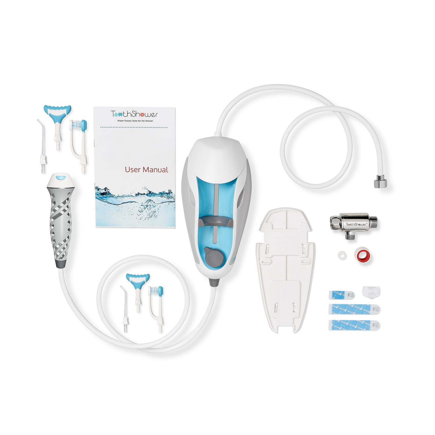 ToothShower 3.1 lives in your shower and utilizes the water flow before your showerhead, eliminating the messiness of a traditional water flosser and saving you precious counter space.